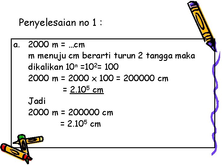 Maka untuk merubah km ke cm turun 5 tingkat atau .
